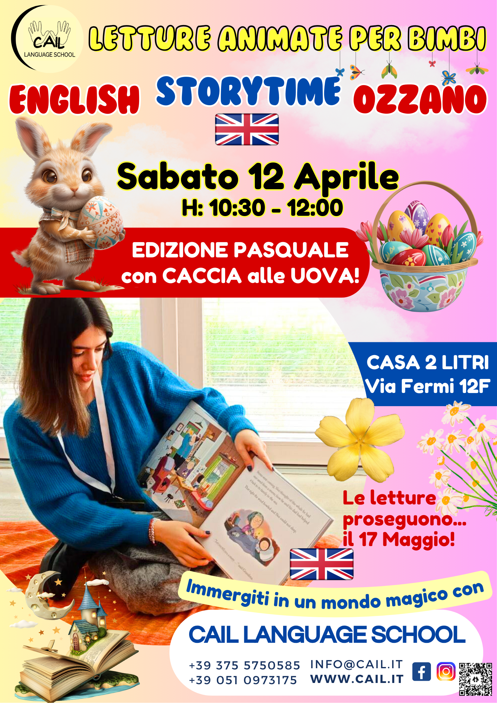 L’appuntamento con lo Storytime è organizzato nella sede CAIL Bologna Savena – Centro di lingue Education, Books and Travels – in via Sardegna 10C. Aspettiamo i bimbi il mercoledì dalle 17:30 alle 19 per un pomeriggio di allegre storie illustrate, giochi e attività dinamiche a tema con il book del giorno, all in English!