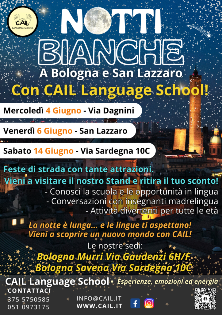Preparati a un’estate all’insegna delle lingue e del divertimento! CAIL Language School ti aspetta per le Notti Bianche, un’occasione unica per immergerti nel mondo delle lingue straniere in un’atmosfera festosa e coinvolgente! Siamo pronti a diventare il tuo nuovo punto di riferimento per esplorare nuove culture e potenziare le tue abilità linguistiche. Vieni a scoprire perché!