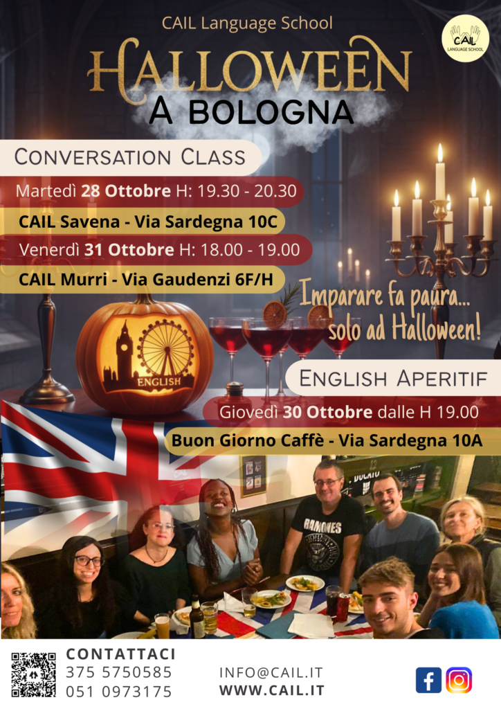 Anche gli adulti possono godersi l’atmosfera di ottobre con tre appuntamenti speciali firmati CAIL, pensati per praticare l’inglese in modo rilassato, stimolante e… leggermente spettrale! Approfondiremo insieme l’origine e le curiosità legate alla tradizione di Halloween e praticheremo lo speaking condividendo esperienze personali, commenti e opinioni su questa festa!