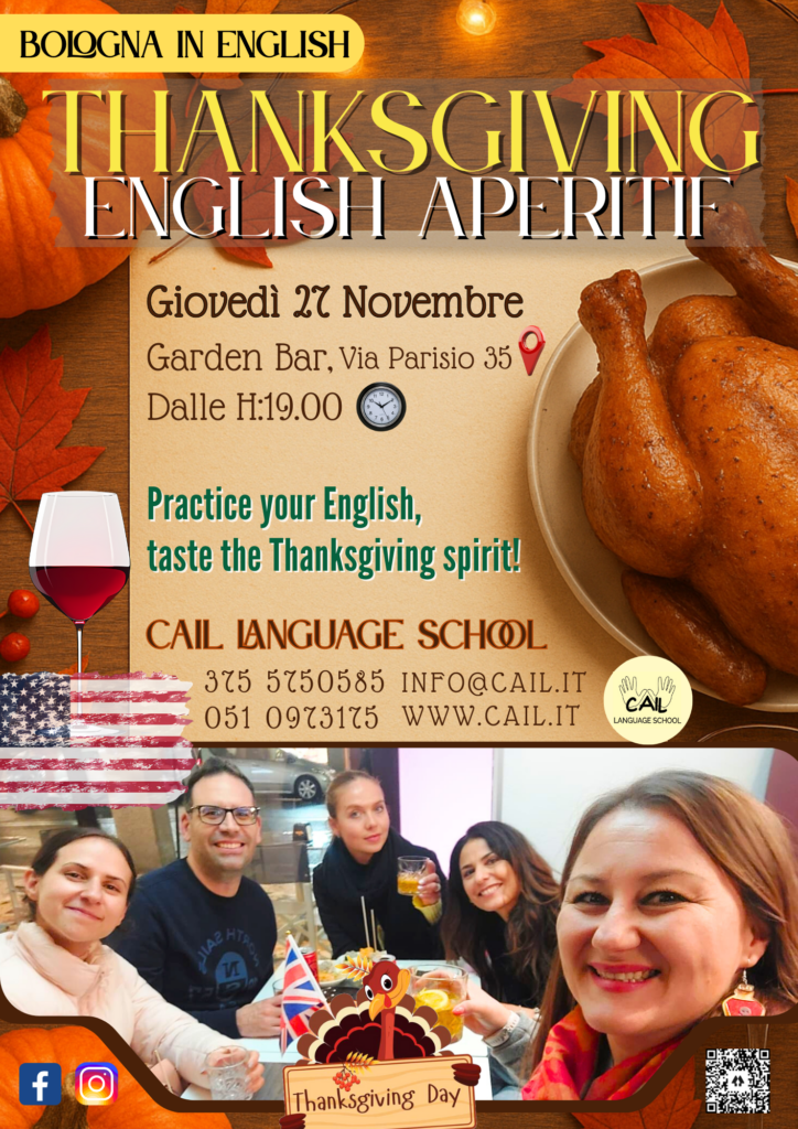 Un’occasione per migliorare l’inglese, conoscere nuove persone, approfondire la festività del Thanksgiving con attività a tema e brindare insieme in perfetto international mood!