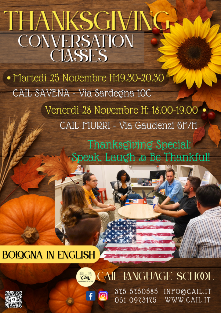 Mercoledì 27 Novembre dalle ore 17:15 alle ore 19:15, presso la nostra sede CAIL Bologna Savena in Via Sardegna 10C, organizziamo un fantastico laboratorio creativo dedicato al tema del Ringraziamento, all in English of course! Un pomeriggio speciale per i più piccoli, con tante attività divertenti, istruttive ed interattive per celebrare insieme questa meravigliosa ricorrenza!