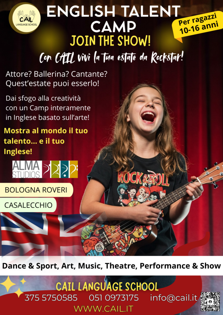 Entra in scena con l’English Talent Camp, il camp estivo dove l’inglese si impara… sotto i riflettori! Una settimana immersiva tra canto, danza, recitazione e performance, interamente in inglese! E attenzione, aspiranti star dai 6 ai 15 anni (gruppi divisi per età): questo camp è pensato apposta per voi, per farvi esprimere al meglio il vostro potenziale! Sviluppa le tue abilità artistiche, migliora la pronuncia e l’espressività, e conquista il palco nel grande spettacolo finale! Se sogni un’estate da protagonista, questo è il camp che fa per te!
